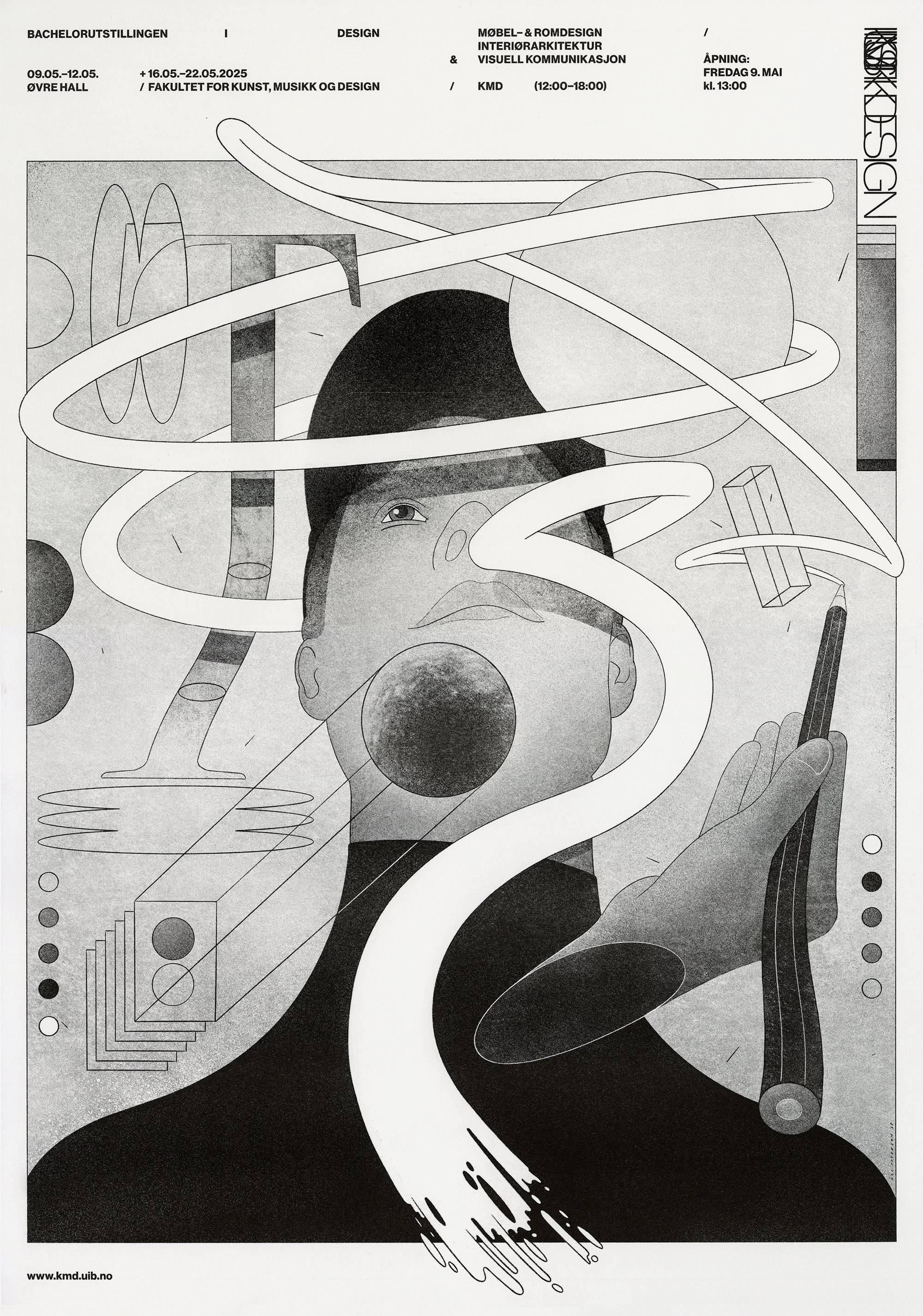 Poster and program illustration for the 2025 bachelor exhibition in design at KMD. Type and riso printing by Mads Andersen at KMD. Design and layout concept: me and Mads.